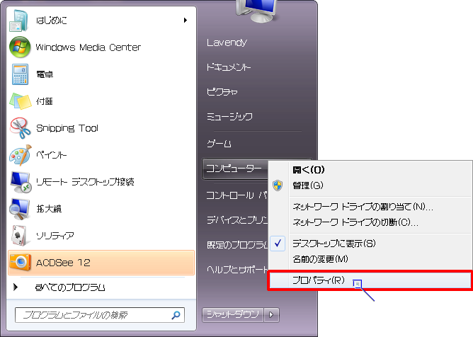 - スタートメニュー の コンピューター を右クリック、 プロパティ を開きます。